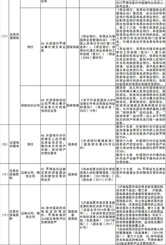 本次《指引》表單部分列明了外資投資設(shè)立金融機(jī)構(gòu)管理(市場準(zhǔn)入限制)和外資準(zhǔn)入后業(yè)務(wù)管理措施(國民待遇限制)兩方面共10個類別、48項(xiàng)特別管理措施,具體包括股東機(jī)構(gòu)類型要求、股東資產(chǎn)規(guī)模要求、股東經(jīng)營業(yè)績要求、資本金要求、股權(quán)結(jié)構(gòu)限制、分支機(jī)構(gòu)設(shè)立與運(yùn)營要求、其他金融機(jī)構(gòu)準(zhǔn)入限制、業(yè)務(wù)范圍限制、運(yùn)營指標(biāo)要求以及交易所資格限制。